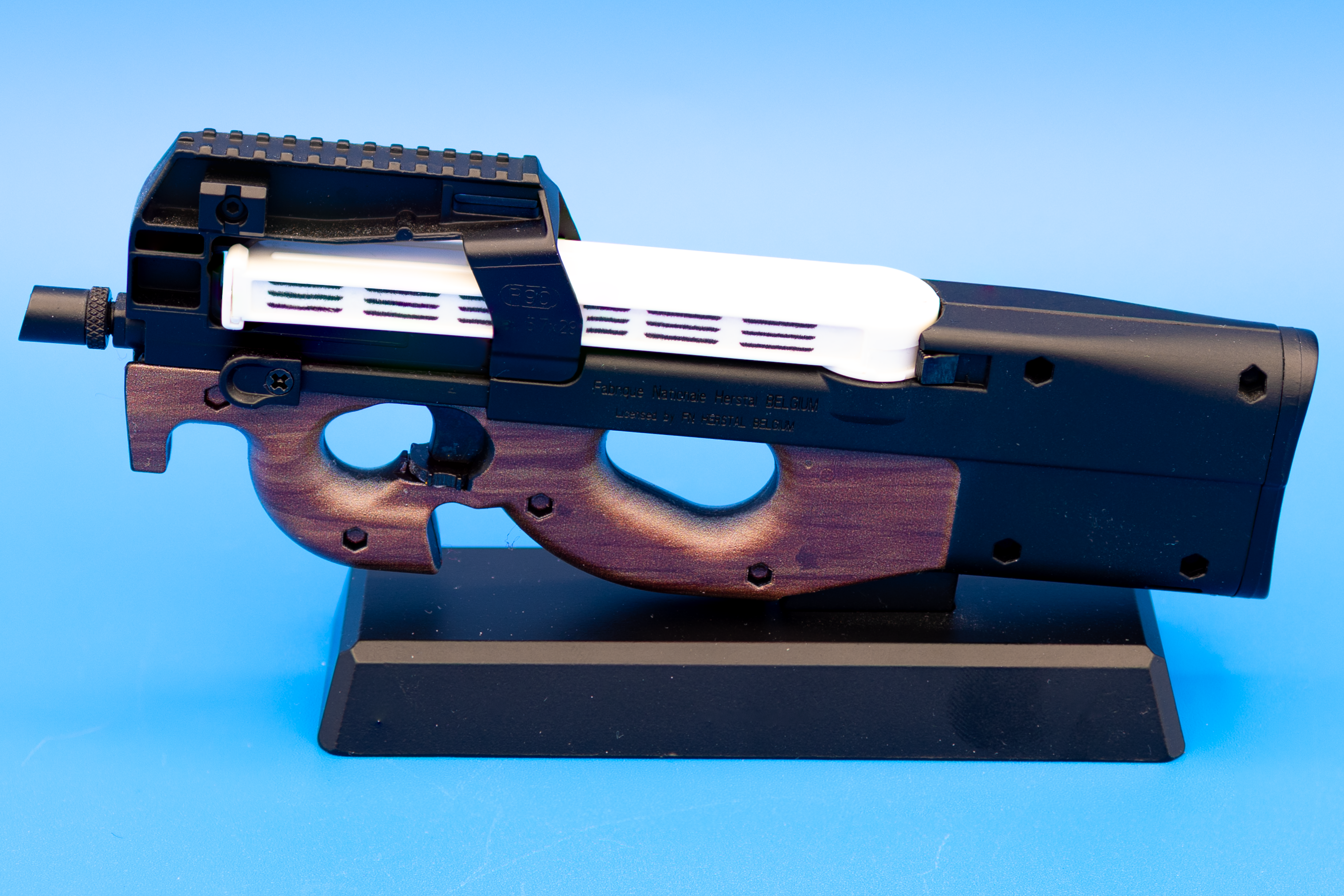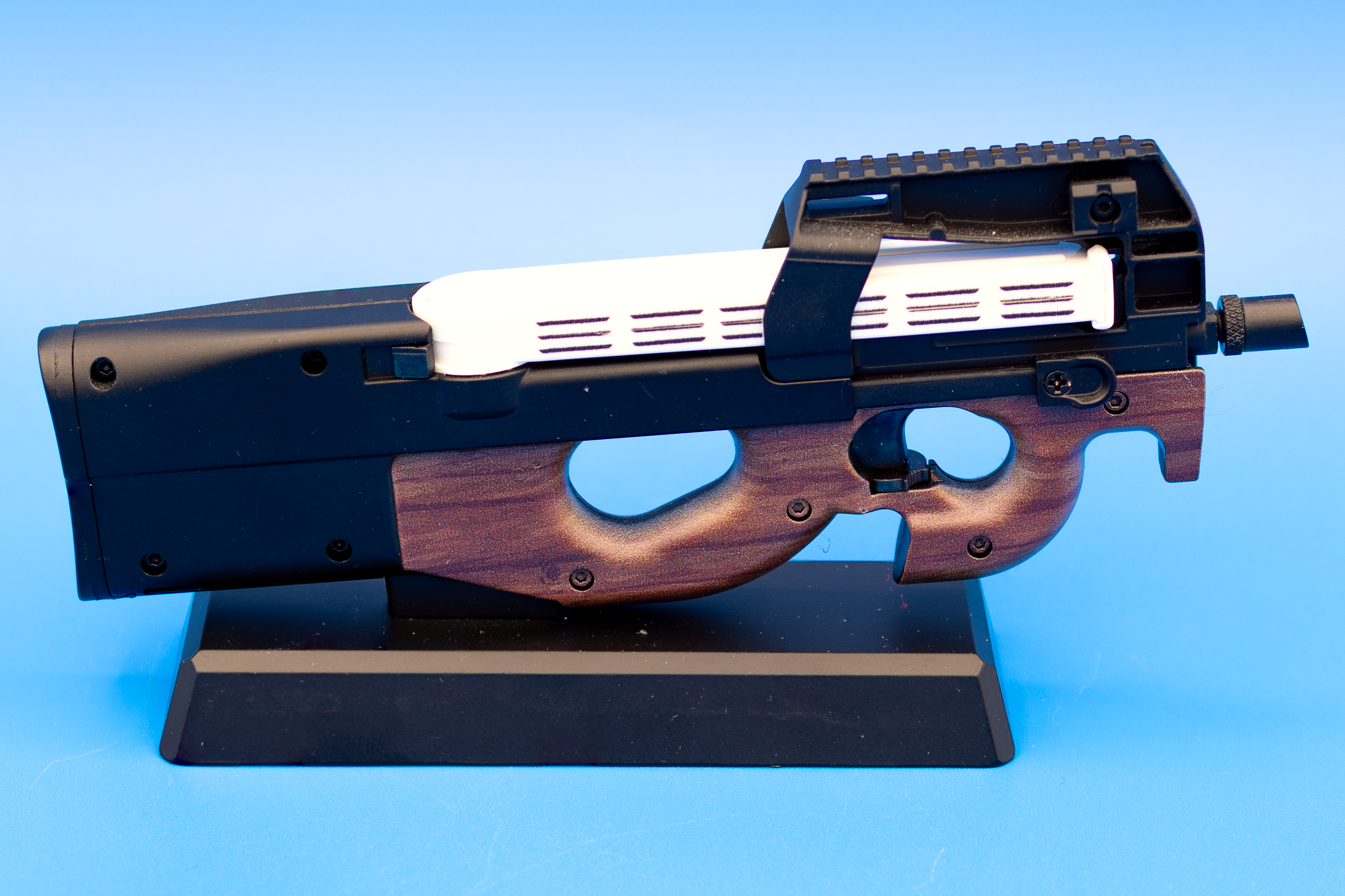 This model uses all the same parts as the black P90, but the bottom grip area up to the line running straight down the body in line with the barrel, and as far back as the second body line coming out from the previously mentioned line straight down from the back of the magazine release, this area has been UV painted to resemble wood grain. Unfortunately, one downside of the UV painting process in those areas the laser can't hit doesn't get painted leaving several edges with a black color breaking up the wood design. The other key difference between the two models is the magazine on this one is an opaque white with six sections one three parallel black lines running down its length on either side. Where the supports for the top rail that wrap around the magazine sit, the lines are not present, which looks odd when the mag is off but completely unnoticeable when it is in place. We also didn't open the magazine to see if they bothered to include the dummy rounds that were present in the translucent mag.